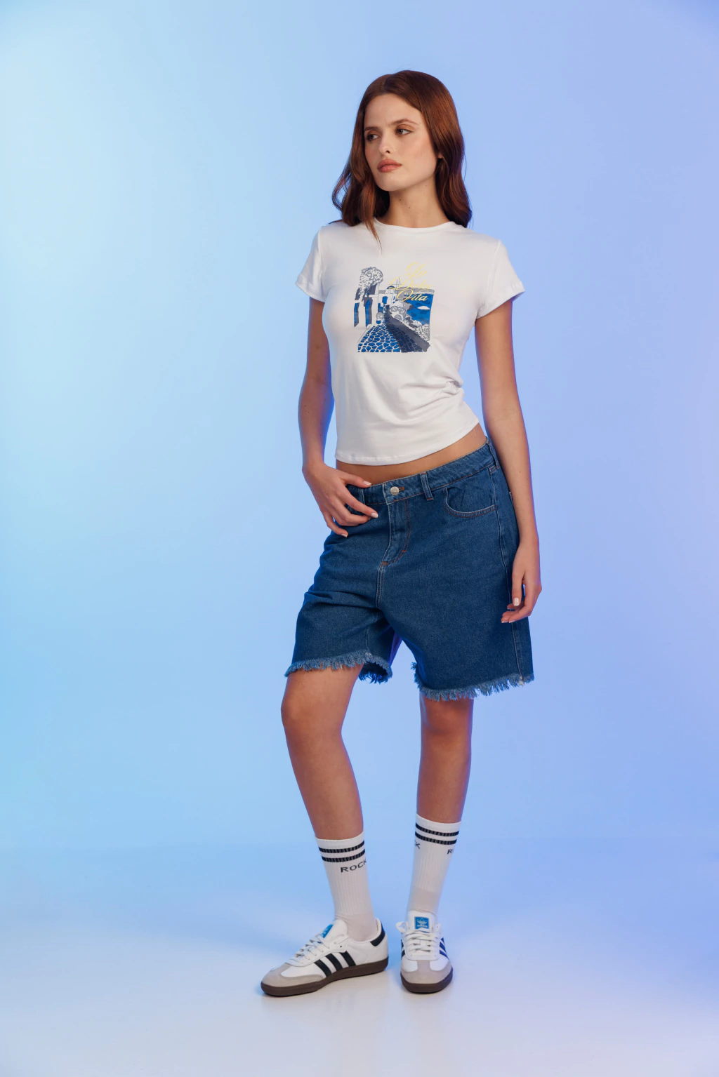 Bermuda unisex calce regular, 5 bolsillos, tiro medio, piernas holgadas y ruedo deflecado.