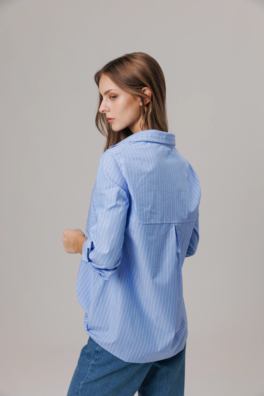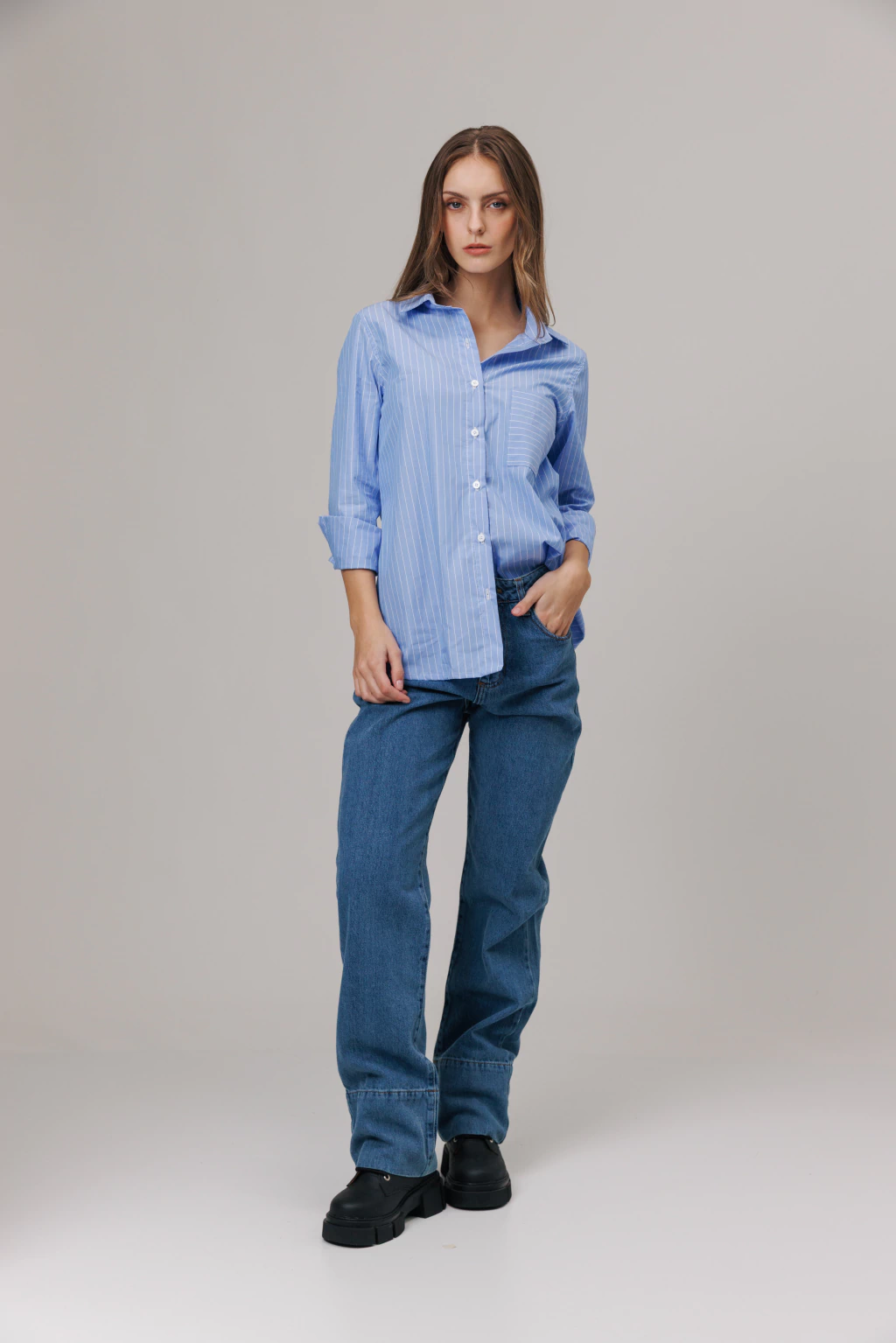 Camisa clasica de corte oversize celeste con rayas blancas. Con cuello camisero y botones, y detalle de un bolsillo plaque.