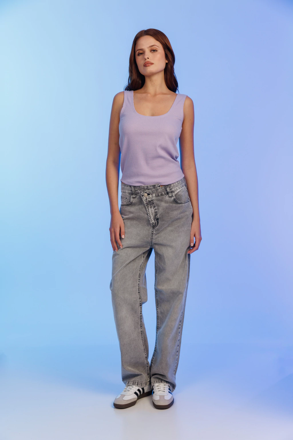 Pantalón con 5 bolsillos, tiro medio, piernas holgadas en muslo y detalle de cintura cruzada.